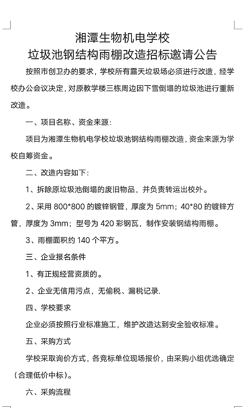 湘潭生物機(jī)電學(xué)校 垃圾池鋼結(jié)構(gòu)雨棚改造招標(biāo)邀請(qǐng)公告 發(fā)布時(shí)間:2019-06-06      來源:湘潭生物機(jī)電學(xué)校