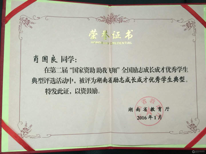 結(jié)束語(yǔ):“上帝為你關(guān)上了一扇門(mén),必定為你打開(kāi)了另一扇窗。”也許,坎坷的經(jīng)歷讓肖國(guó)良比同齡人早熟,但這不正讓她多了一份責(zé)任和使命嗎?心中有夢(mèng)想,一路不孤單。據(jù)湘潭市學(xué)生資助中心王頌麗主任介紹,2016年,該市將深入推進(jìn)學(xué)生資助工作與“立德樹(shù)人”相結(jié)合,積極組織參與全省范圍開(kāi)展的“我身邊的資助故事”主題征文等宣傳教育活動(dòng),充分挖掘受資助的優(yōu)秀學(xué)生典型,用學(xué)生身邊的真實(shí)事例激勵(lì)廣大學(xué)生積極進(jìn)取、立志成才,不忘感恩回報(bào)社會(huì),不忘承擔(dān)國(guó)家建設(shè)之責(zé)。在黨和國(guó)家大力發(fā)展職業(yè)教育的時(shí)代潮流中,在各界人士關(guān)心職業(yè)教育的大好環(huán)境中,相信肖國(guó)良在追夢(mèng)的歷程中,一定會(huì)綻放別樣的精彩!