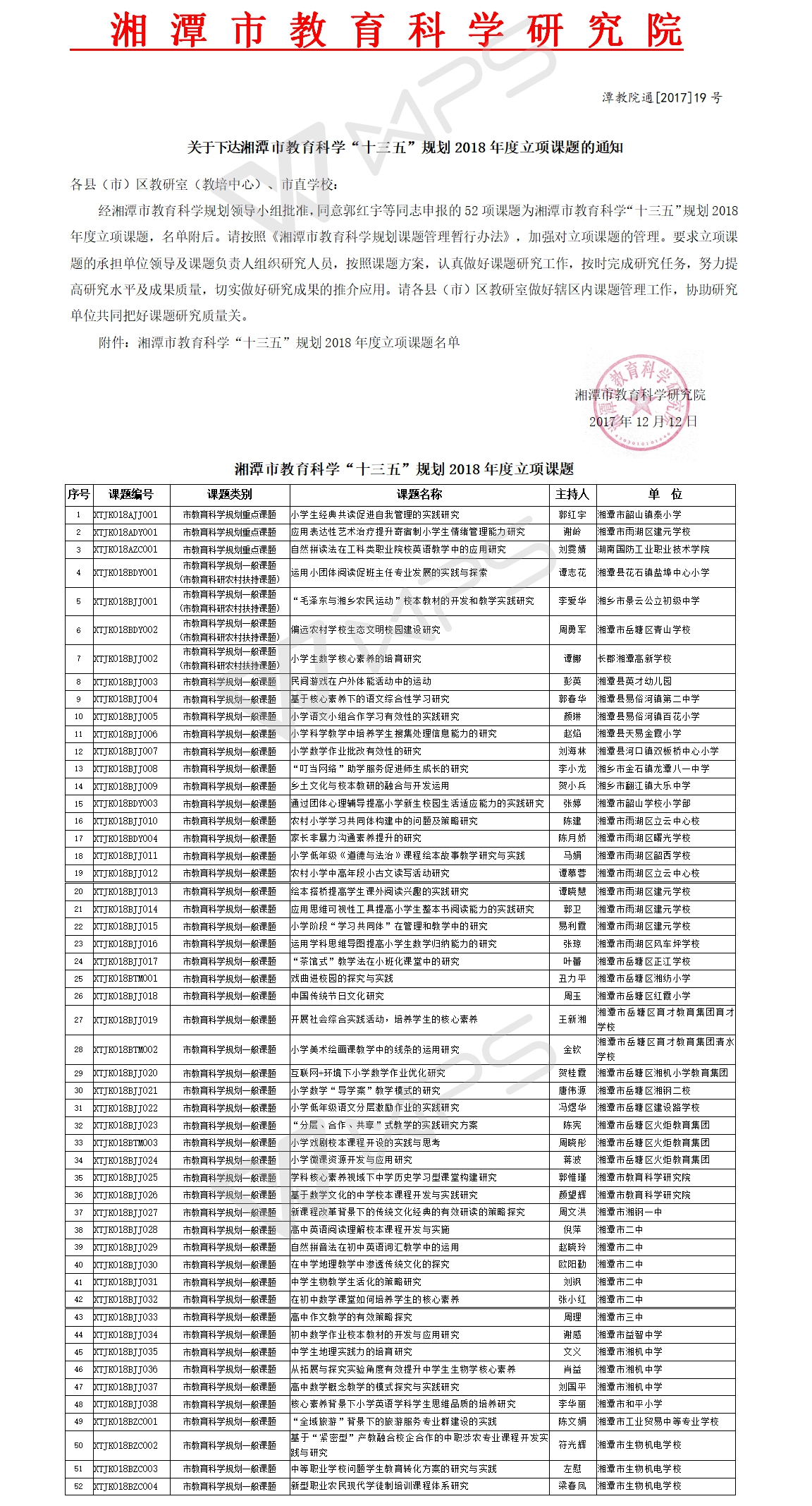 湘潭市教育科學(xué)規(guī)劃2018年立項(xiàng)課題通報(bào) (紅頭、蓋章文稿) 發(fā)布時(shí)間:2019-06-05      來(lái)源: